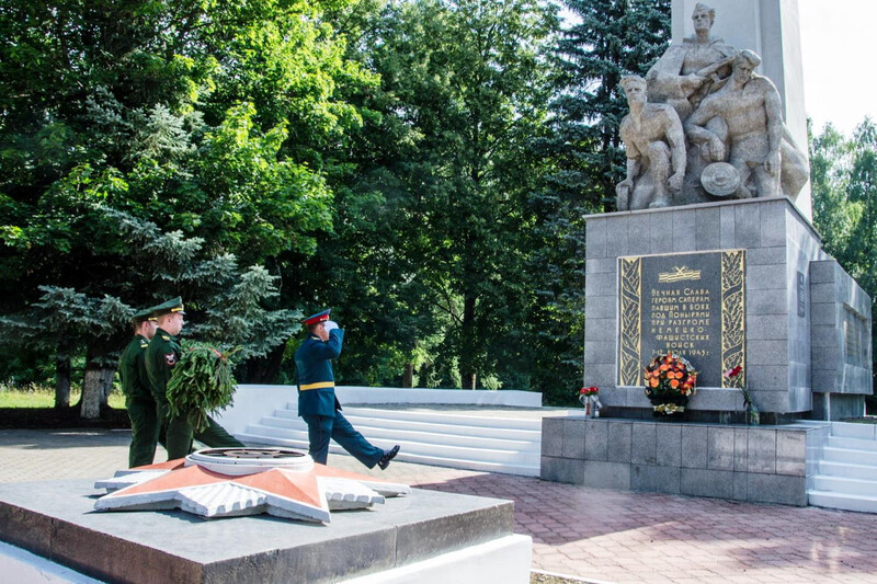 Возложение еловой гирлянды к памятнику воинами 1 исбр. Поселок Поныри Курской области. 7.2018